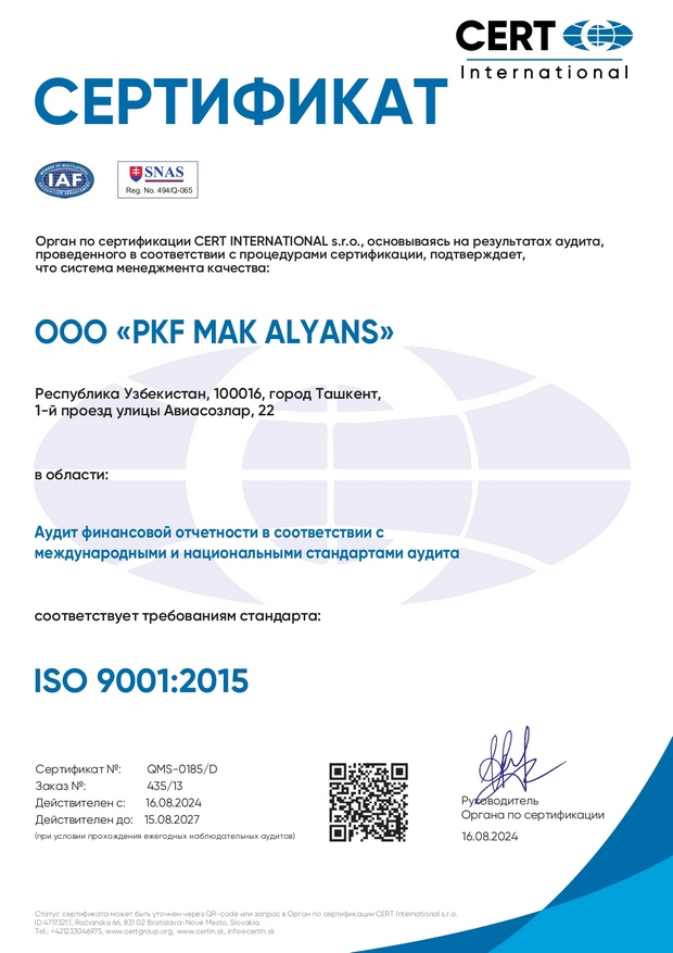 Лицензии и сертификаты Лицензия на осуществление аудиторской деятельности Сертификат на право проведения аудиторских проверок в банках "Сертификат ISO 9001:2015" Политика в области качества Аудиторской Компании ООО «PKF MAK ALYANS»