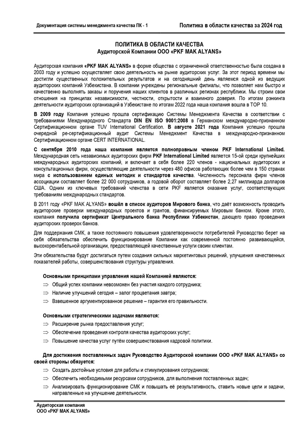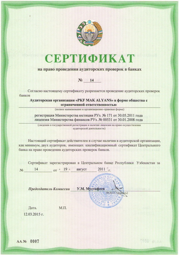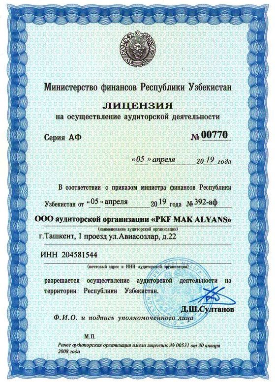 Лицензии и сертификаты Лицензия на осуществление аудиторской деятельности Сертификат на право проведения аудиторских проверок в банках "Сертификат ISO 9001:2015" Политика в области качества Аудиторской Компании ООО «PKF MAK ALYANS»